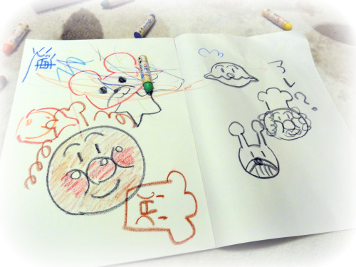 ジローはクレヨンでお絵かきするよりも、クレヨンをばらしてケースにしまって、またバラして・・・のが楽しいらしくて永遠とやってます・・・。